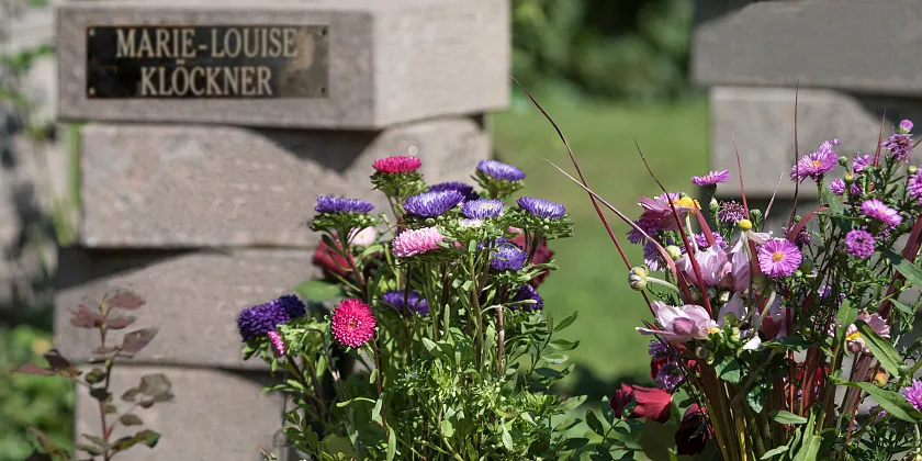 Eine Ablagefläche für Gestecke und Blumen bietet die Möglichkeit für persönliche Abschiednahme und Gedenken. Um die Pflege der gärtnerisch schön gestalteten Anlage kümmert sich die Friedhofsverwaltung.