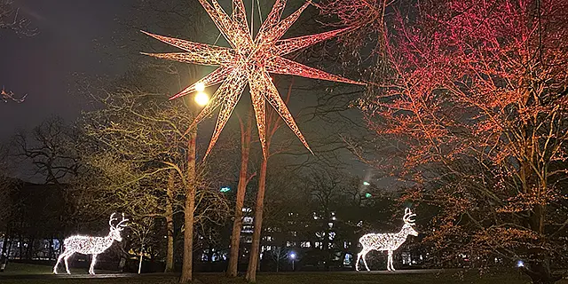 Ein Spaziergang zu den Wallanlagen am Herdentorsteinweg trägt in diesen Tagen übrigens gleich doppelt zur festlichen Stimmung bei. Denn der Stern wird von einer leuchtenden Hirschfamilie der CityInitiative in seinem Funkeln begleitet. Weitere Weihnachtsbeleuchtungen finden sich an verschiedenen Orten der Innenstadt.