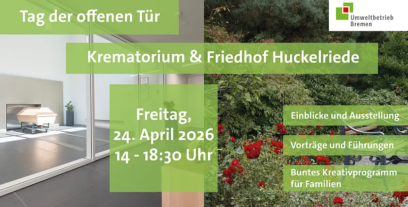 Am 24. April 2026 laden wir von 14:00 Uhr bis 18:30 Uhr zum Tag der offenen Tür ein. Freuen Sie sich auf ein abwechslungsreiches Programm mit Führungen, Vorträgen und einer Ausstellung. Für Interessierte und Familien bietet sich an den Ständen des Bestatterverbands Bremen, der ansässigen Friedhofsgewerke und des UBB ein buntes Mitmachangebot.